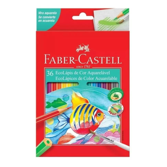 Deixe a criatividade fluir com os Ecolápis de Cor Aquarelável da Faber-Castell. Seus desenhos mais vivos e realistas com 36 cores vibrantes com perfeita cobertura. Com o uso de um pincel, seu desenho vira aquarelável! O formato do Ecolápis é sextavado e sua fórmula é exclusiva, utilizando o processo especial de fabricação TS - Técnica Sekural, que proporciona maior resistência à ponta do seu Ecolápis. ATENÇÃO: Não mergulhe os Ecolápis Aquareláveis na água. Madeira 100% proveniente de manejo florestal sustentável e certificado pelo FSC: respeito ao meio ambiente. Produto atóxico e não perecível.